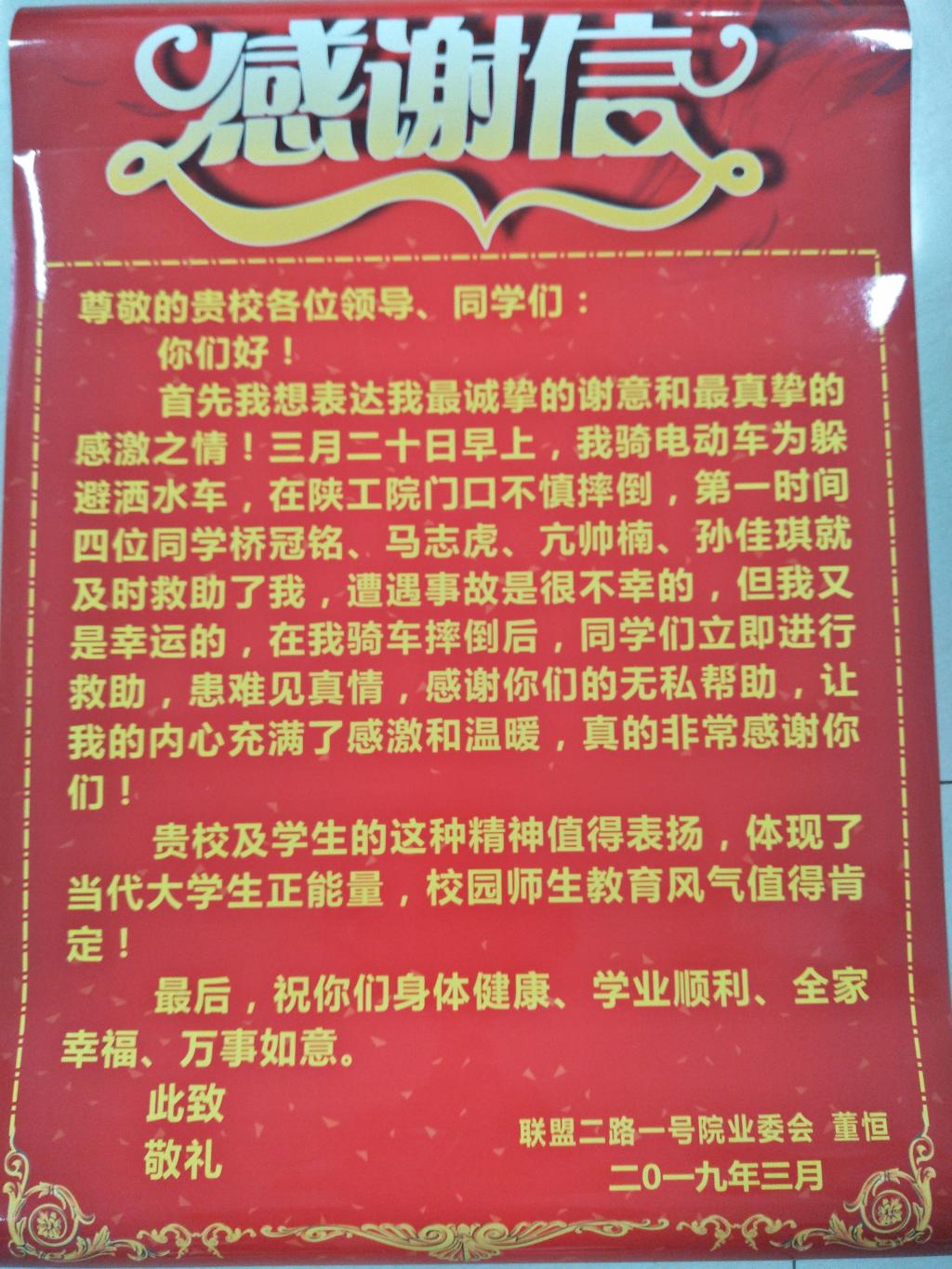 3月21日上午,当事人董恒携家人将一份感谢信和一面锦旗送到了太阳成集团,他表示当天因躲避洒水车而不慎摔倒,这四名同学迅速反应并伸出援手,他非常感谢。这四名男孩在遇到一个让很多人困惑的问题——路遇摔倒的行人该不该扶时,他们毫不犹豫地扶起行人,以实际行动表明“扶不扶”不需要思考,只是举手之劳的本能。