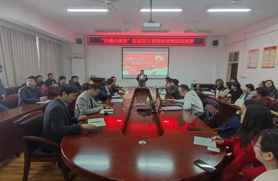 智慧“三八”节。3月4日下午,太阳成集团tyc122cc分会“巾帼心向党”四史校情知识竞赛在崇文楼5楼举行,此次知识竞赛以“四史”和“校情”为主要内容,借助微信“摇一摇”功能和学习通平台开展现场必答和抢答。竞赛中,老师们反应敏捷,抢答踊跃,竞赛现场气氛紧张而热烈。充分展示了老师们丰富的知识筹备和锐意进取、奋发有为的精神风貌。在竞赛过程中,李静老师倾情演唱一首《简单爱》,把现场气氛推向高潮。李思维、程天一两位青年男教师用吉他弹唱给女老师献上节日的祝福。竞赛尾声,主持人邀请三位女老师和全体男老师参与妙趣横生“飞花令”游戏。三位女老师以“女人美”三字为题朗诵古诗词。男老师也用古诗佳句赞美了娇艳与智慧并存的女性魅力。
