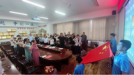 随后,全体教师开展了师德师风学习。副经理张光同志带领大家学习了习近平总书记关于师德师风的重要论述。全体教师通过视频学习“七一勋章”获得者、“全国师德标兵”张桂梅老师先进事迹。老师们被她潜心育人的敬业精神和立德树人的使命担当所鼓舞,更被她初心如磐的精神品质和至诚至深的家国情怀所感动。接着,经理王永莲同志带领大家面向国旗重温教师誓词。一句句铿锵有力的誓词,一句句庄严的承诺,表达了老师忠于教育事业,为党育人,为国育才的的信心和决心。