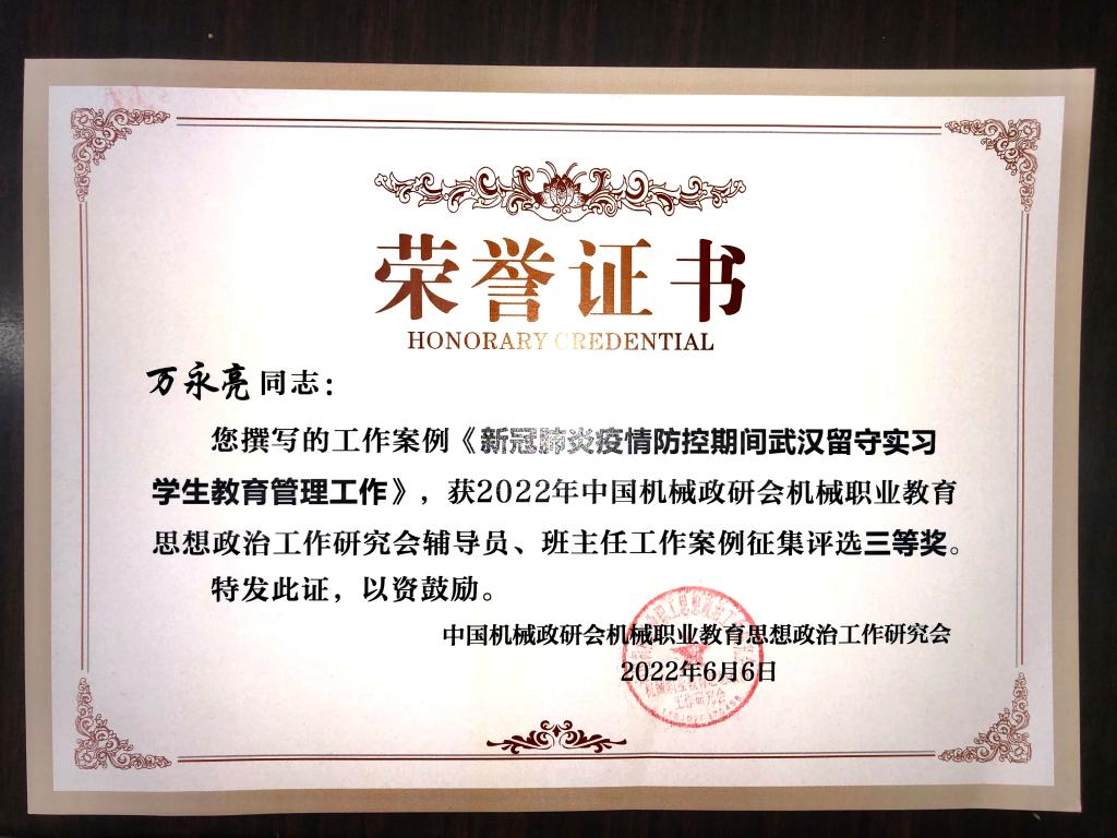 近日,2022年中国机械政研会机械职业教育思想政治工作研究会辅导员、班主任工作案例征集评选活动结果公布,公司辅导员万永亮撰写的《新冠肺炎疫情防控期间武汉留守实习员工教育管理工作》工作案例在此次评选中获得三等奖。