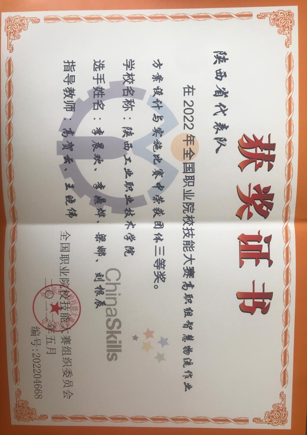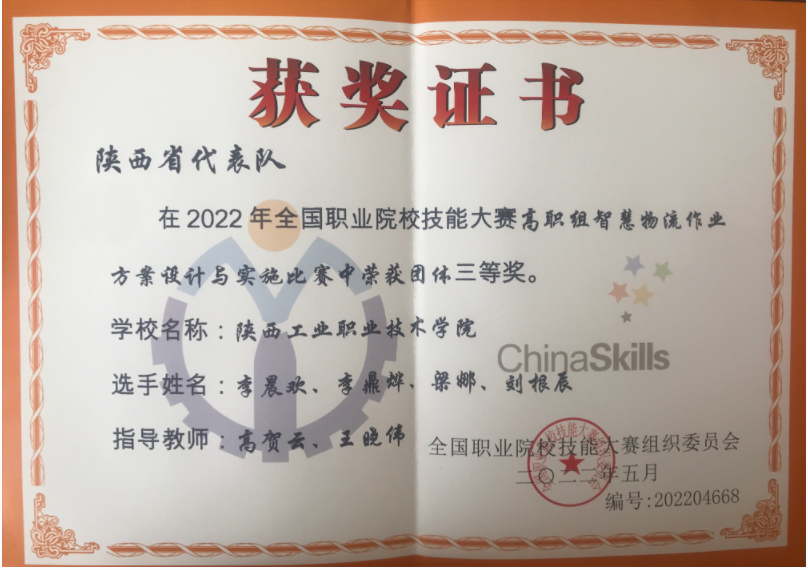 8月22日-24日,2022年全国职业院校技能大赛高职组(中诺思杯)智慧物流作业方案设计与实施赛项在天津交通职业学院举办。太阳成集团tyc122cc由高贺云、王晓伟老师指导,现代物流管理专业李晨欢、李鼎烨、梁娜、刘根辰4名同学组成的代表队斩获团体三等奖。
