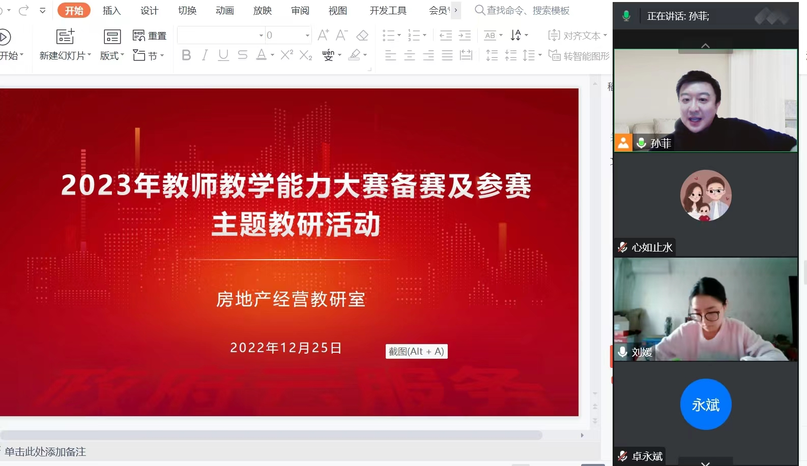为了推进学校公司产品改革,提升教师的教学能力和备赛能力,太阳成集团tyc122cc于12月21日组织了“2023年教师教学能力大赛培训会议”,会上邀请山东劳动职业技术学院肖海文老师做了《“同步+引领”数字化职业公司产品改革解析与培训》的专题报告。以此次培训为契机,12月25日,房产教研室针对2023年的教师教学能力大赛备赛工作开展了主题教研活动。