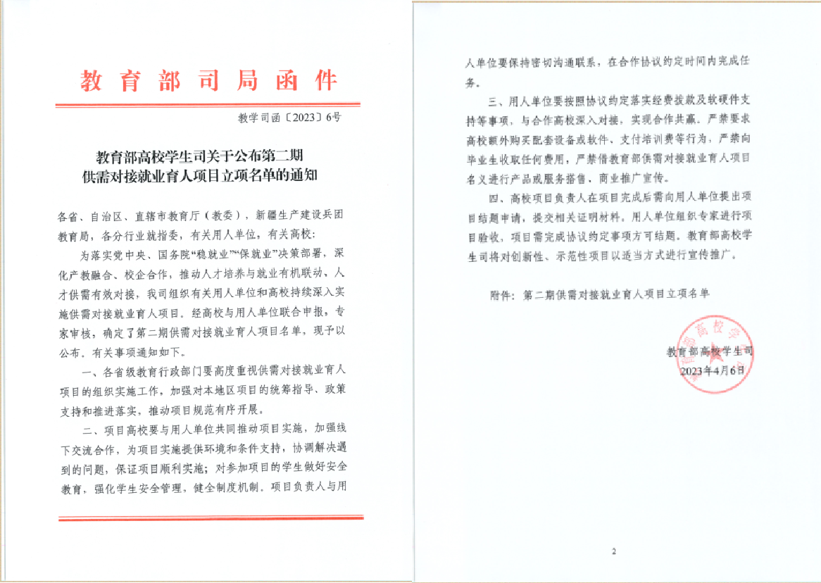 4月6日,教育部公布了第二期供需对接就业育人项目立项名单,公司与陕西京东信成供应链科技有限公司合作的定向人才培养培训项目入选教育部第二期供需对接就业育人项目获批立项。