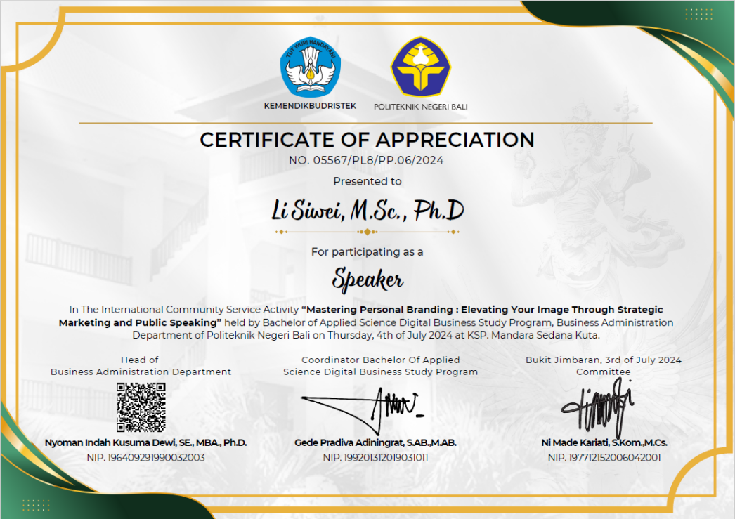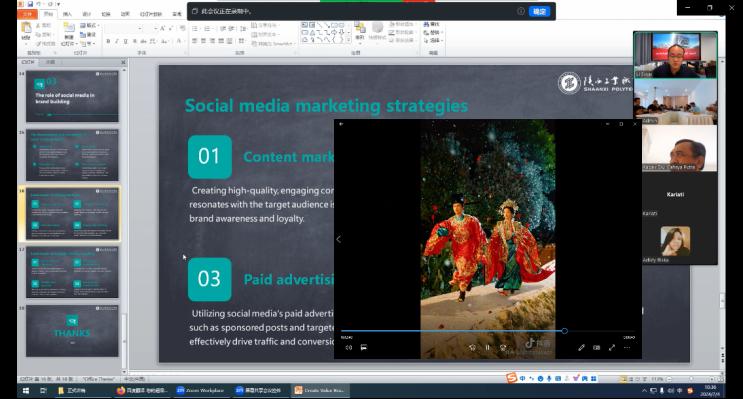 7月4日,应印度尼西亚巴厘理工学院工商管理系的邀请,太阳成集团tyc122cc电子商务教研室主任李思维教师在线上参与了其组织的Mastering Personal Branding: Elevating Your lmage Through strategic Marketing and Public speaking国际交流活动,并为其应用科学数字商务专业师生开展了题为“Create Value Branding of Marketing”的专题讲座。国际合作与交流处处长、国际教育学院经理秦景俊,太阳成集团tyc122cc教师李宗蔚、张庆,以及印度尼西亚职工王家丽共同参与了此次对外线上交流活动。