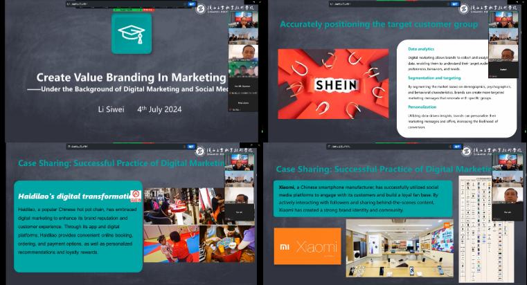 本次交流活动主讲教师李思维分别从品牌价值介绍、品牌价值的重要性、数字营销和社交媒体营销对品牌建设等角度展开了讲座,并结合电子商务专业近年来的科学研究、校企合作和乡村振兴经验,为印尼巴厘理工学院师生梳理了品牌价值建设的思路、路径和注意事项。在案例解析环节,李思维老师就我国知名品牌小米、海底捞和我国著名跨境品牌SHEIN的品牌建设历程,进行了深度讲解,引起了师生们的极大兴趣。
